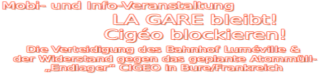 Der Bahnhof Lumeville „La Gare“, ist seit 2007 ein zentraler und kollektiver Widerstandsort des Anti-Cigéo-Kampfes. Er liegt direkt an der künftigen Castor-Strecke, auf der die radioaktiven Abfälle transportiert werden sollen, und stellt eine rechtliche und physische Barrikade dar, die den Bau des Endlagerprojekts direkt behindert. Heute droht ihm die Räumung infolge der derzeit laufenden Enteignungen. Seit der gewaltsamen Räumung der Waldbesetzungen steht der Widerstand in Bure also vor einer neuen Konfrontation mit der Atommafia und den staatlichen Behörden, die sie schützen.